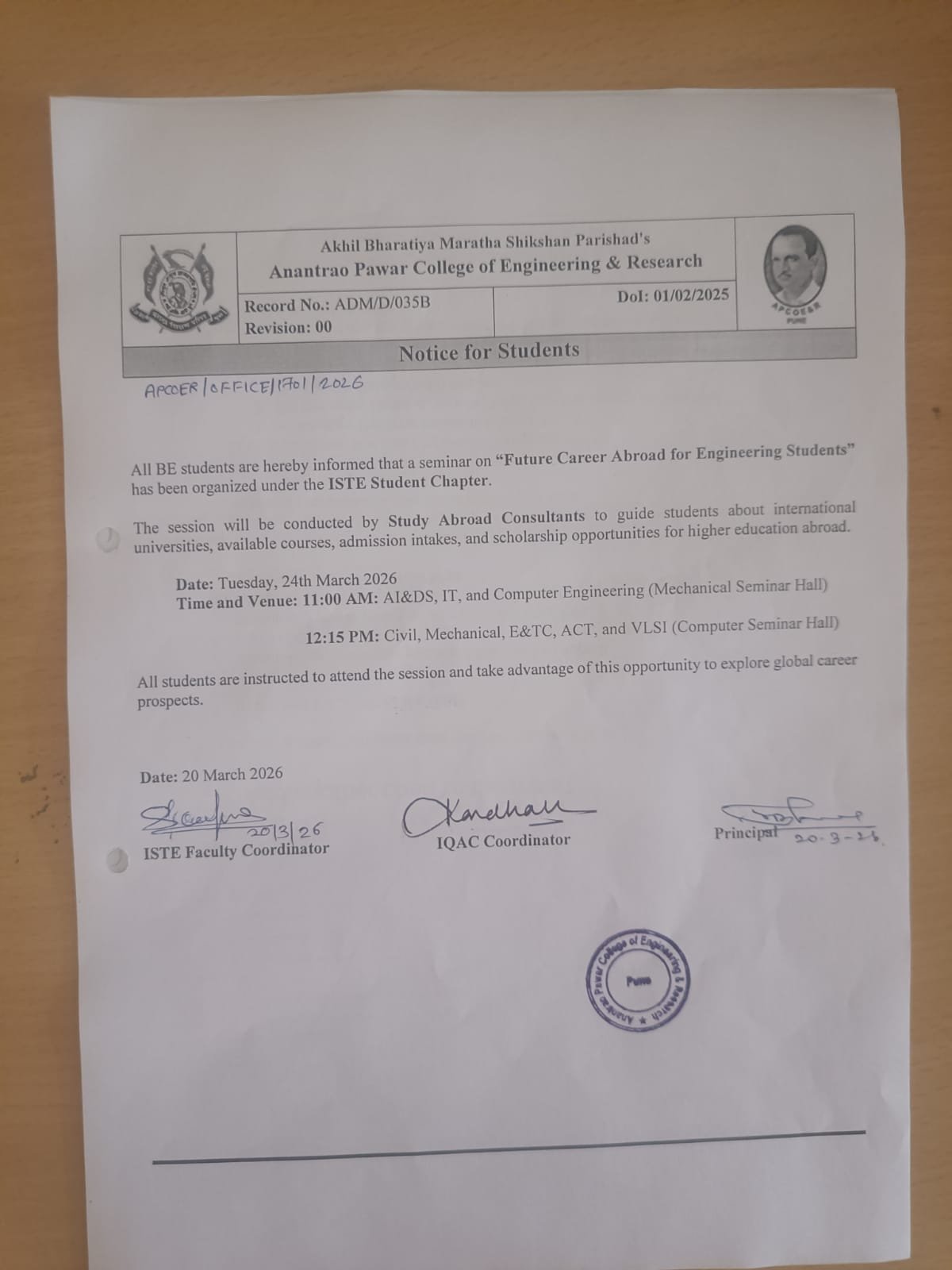Anantrao Pawar College of Engineering and Research is situated in nation’s education hub, Pune and recognized for its quality education and research. It is the institute of Akhil Bhartiya Maratha Shikshan Parishad, Parvati Pune 09, an educational trust was founded by a team of renowned educationists and social reformers. The institute is situated in the area of 10 acres of land surrounded by beautiful landscape of Sahyadri Hills of Western Ghat nearing to famous Parvati Hills. The institute is established in 2012 having 5 UG and 2 PG courses affiliated to SPPU, Pune. Institute is on creating versatile engineers who can apply their knowledge and skills in any field across the globe. Highly qualified faculty members, well equipped laboratories, extensive industry – academia interactions all serve to make engineering education at APCOER campus a unique and enriching experience.